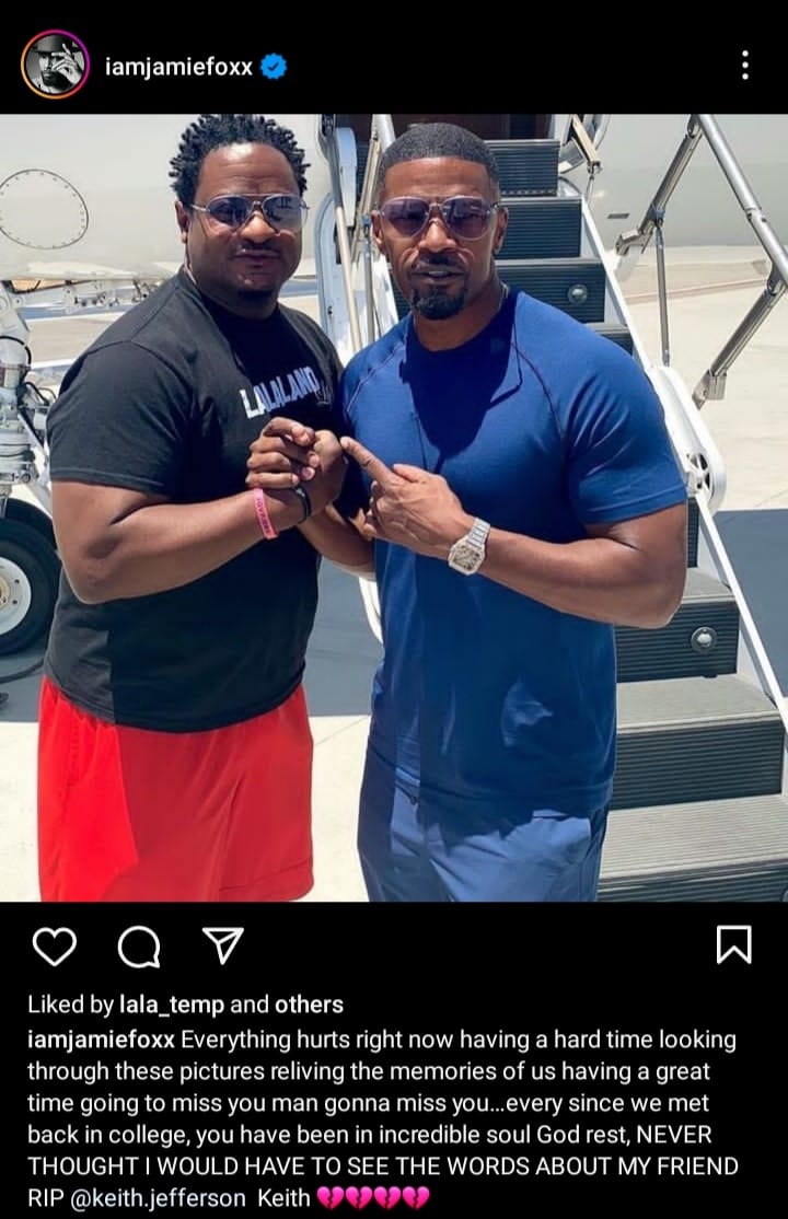In a poignant gesture, Foxx shared a photo of himself and Jefferson in a handshake pose beside a private plane on Thursday, October 5, and paid a heartfelt tribute to his departed friend.