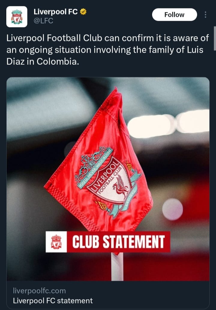 “Liverpool Football Club can confirm it is aware of an ongoing situation involving the family of Luis Diaz in Colombia.