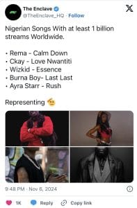A new list with names of Nigerian artists whose songs have gotten to one billion streams worldwide. According to the post there are four male artists and one female artist on the list. The male artists are Burna boy, Rema, Ckay and Wizkid.