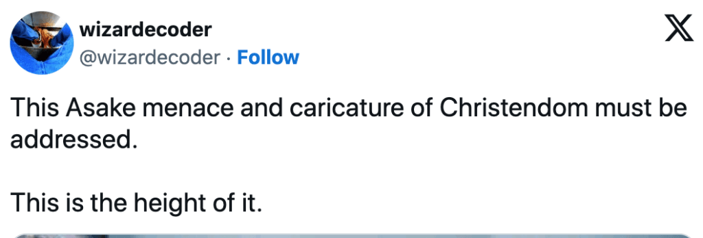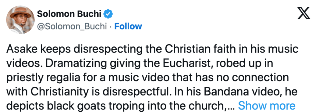 In the video for his new song, Asake, alongside his backup singers and dancers, dressed in a Catholic-like priestly robe, portraying themselves as priests conducting a mass with angelic rings on their heads’.