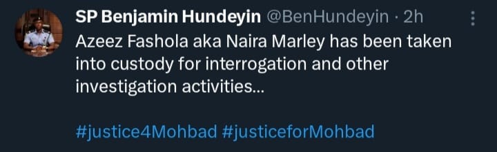 “Azeez Fashola aka Naira Marley has been taken into custody for interrogation and other investigation activities…”