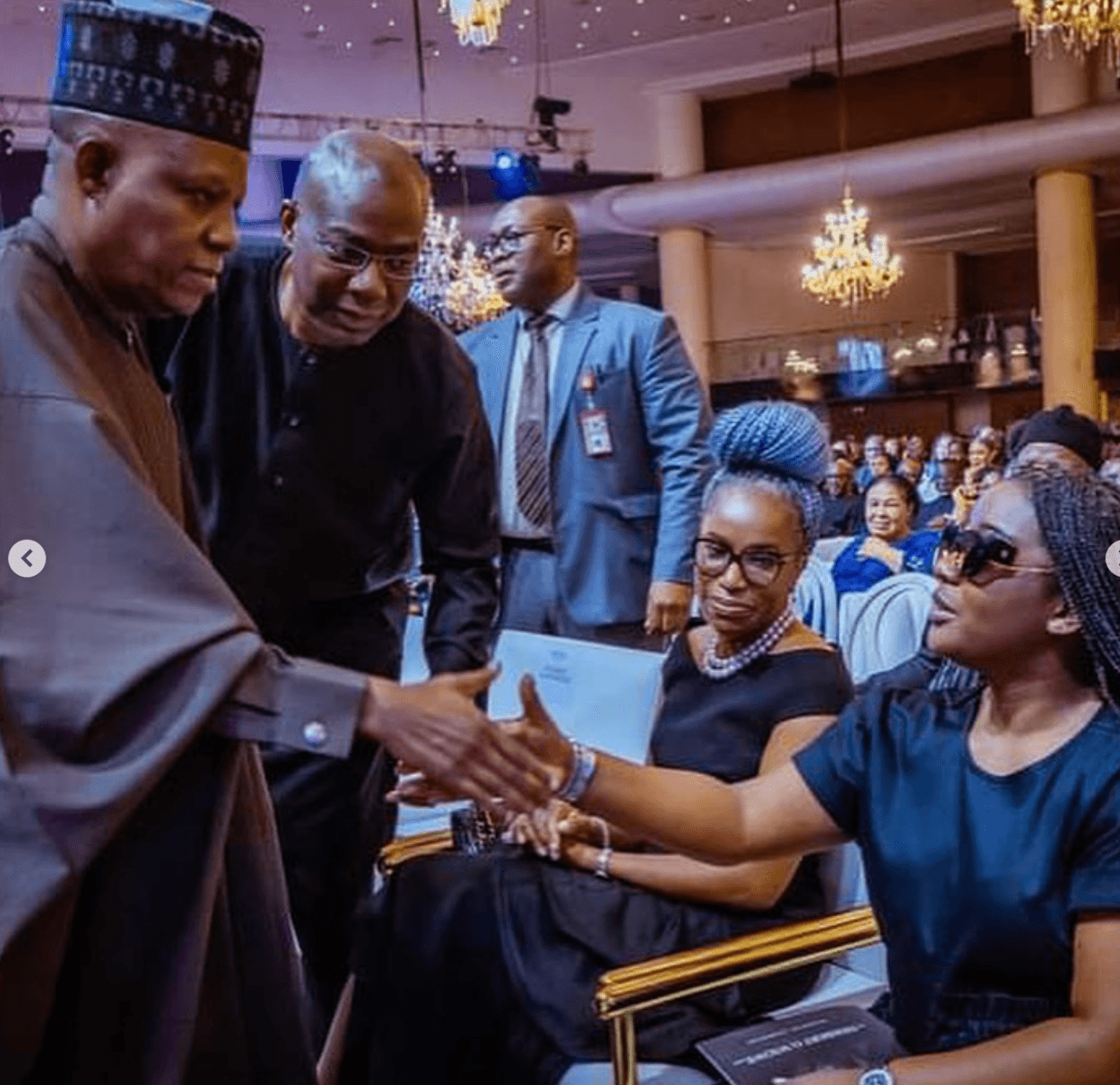 However, in a photo that has become a growing sensation, Tochi is seen shaking the Vice president, Shettima during the night of tribute to her late father, seated.