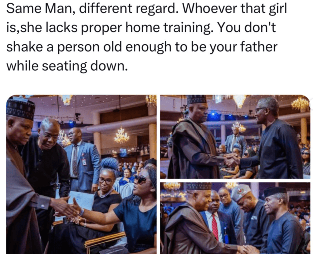 Photos of respected dignitaries, such as Aliko Dangote and former Vice president, Yemi Osinbajo standing to shake Shettima was also shared in comparison.
