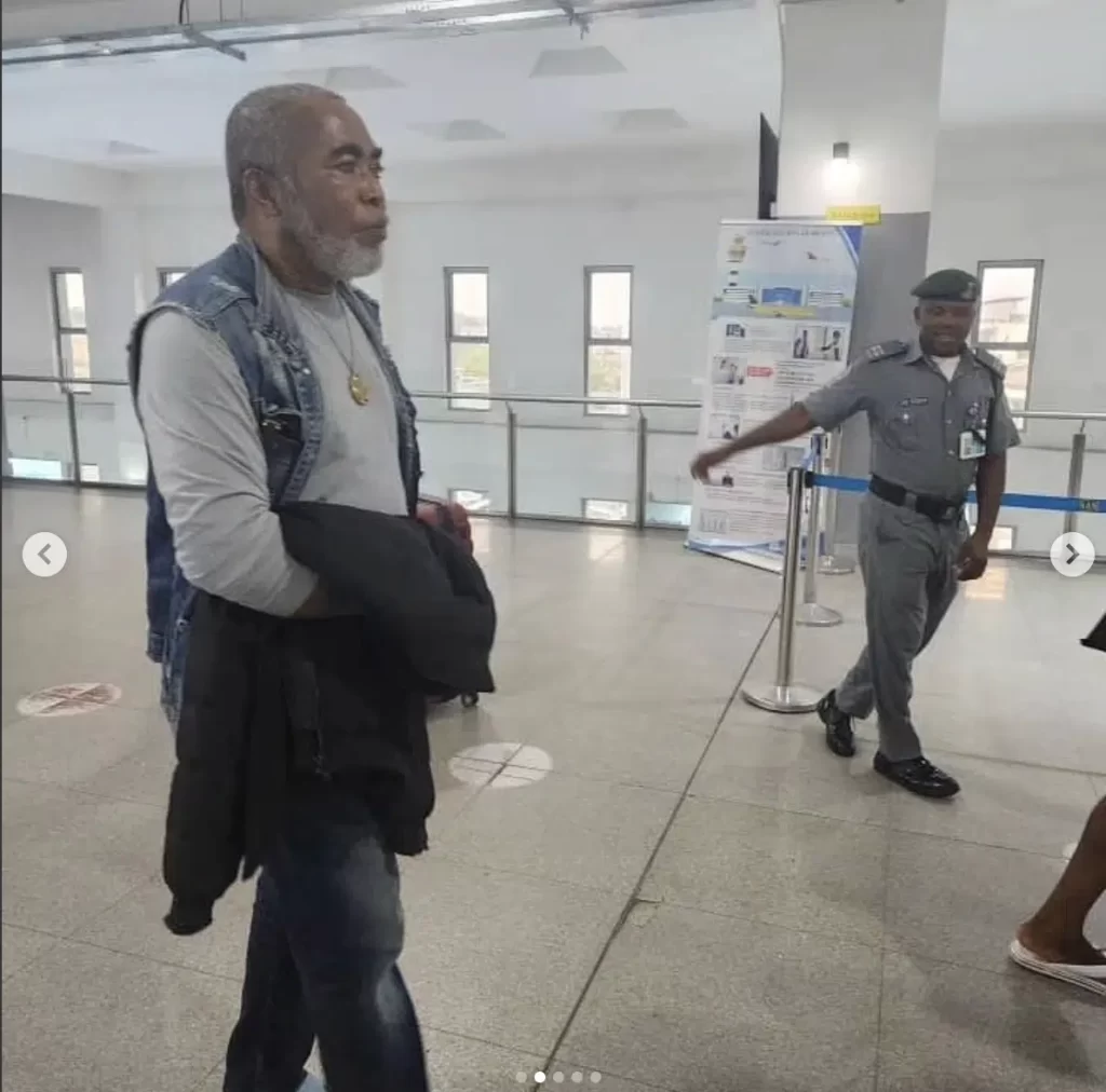 Photos of veteran Nollywood actor, Zack Orji, on his way out of the country to the UK for his post-surgery evaluation has surfaced on social media.