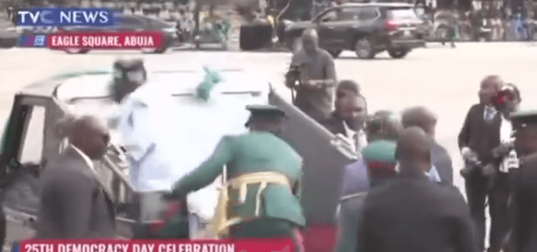 Nigerians have reacted following a dramatic fall of President Bola Tinubu, on Wednesday, while boarding the parade vehicle at the venue of the 2024 Democracy Day.