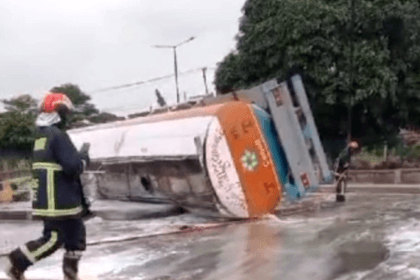 Tragedy Averted As Truck Carrying Petrol Overturns In Lagos