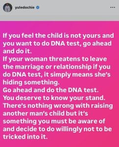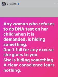 In a provocative Instagram post, Yul Edochie claimed that women who refuse to undergo DNA testing for their children are hiding something, urging men not to accept any excuses.